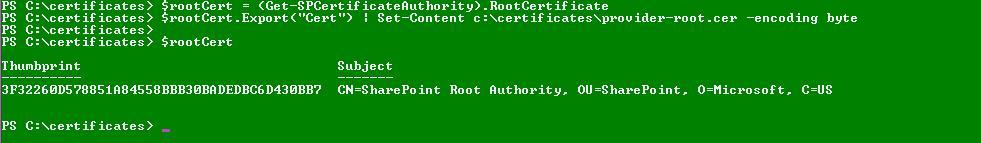$rootCert.Export(“Cert”) | Set-Content c:\certificates\provider-root.cer -encoding byte