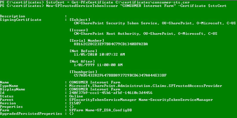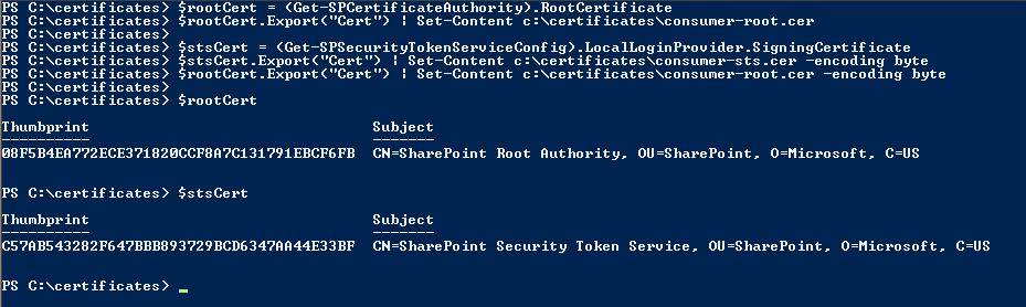 $stsCert.Export(“Cert”) | Set-Content c:\certificates\consumer-sts.cer -encoding byte