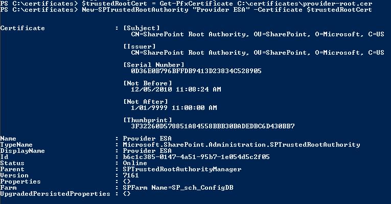 New-SPTrustedRootAuthority “PROVIDER <FARM NAME>” -Certificate $trustedRootCert