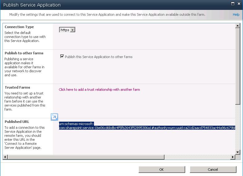 Then select the connection type, check the checkbox “Publish this service application to other farms” and copy out your Published URL.