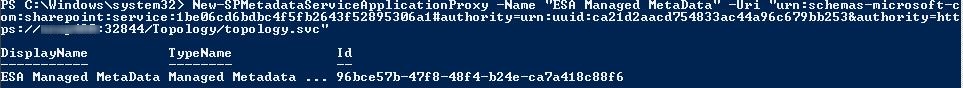 New-SPMetadataServiceApplicationProxy -Name “<FARM NAME> Managed Metadata” -Uri “<Insert Service Topology Uri from step 8.>”