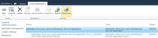 Click on “Application Discovery and Load Balancer Service Application” and click “Permissions” from the ribbon.
