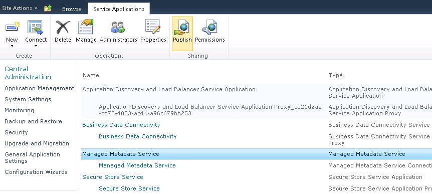 Browse to Service Applications, select the application you wish to publish and click “Publish” on the ribbon.