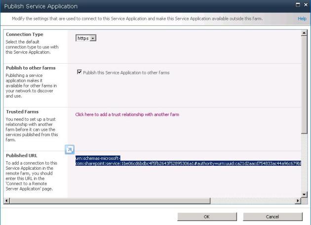 Then select the connection type, check the checkbox “Publish this service application to other farms” and be sure to copy out your Published URL to your clipboard.