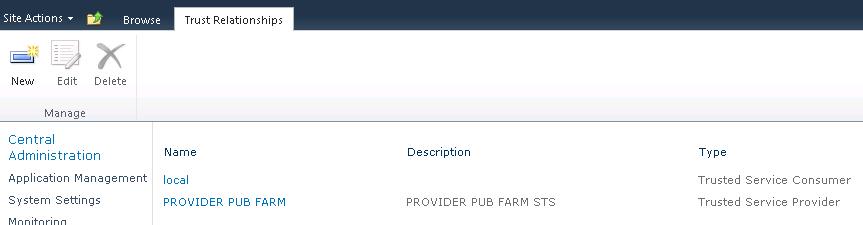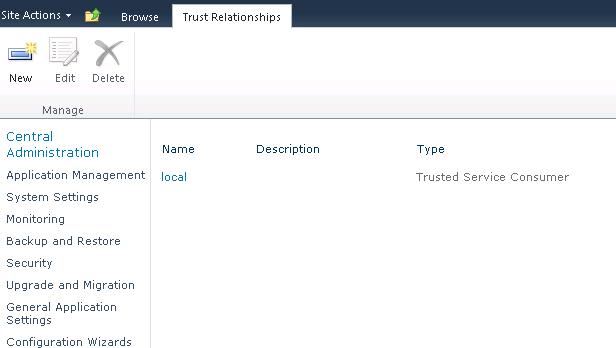 As per the previous steps open up Central Administration, and browse to “Security” then click on “Manage Trust”, then click “New” on the ribbon.