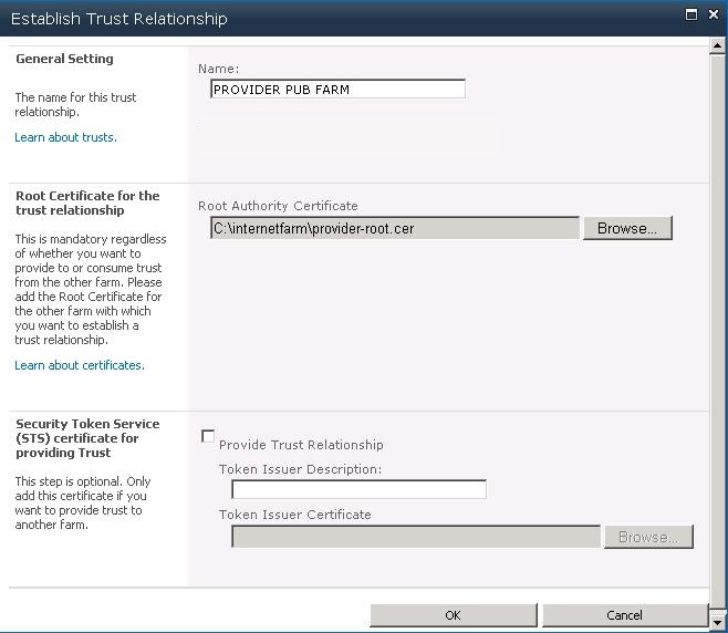 A new screen should pop up labelled “Establish Trust Relationship”.  Put in the name.  I generally use “PROVIDER [FARM NAME]” to denote a certificate imported from a PROVIDER farm, and vice versa for CONSUMER.