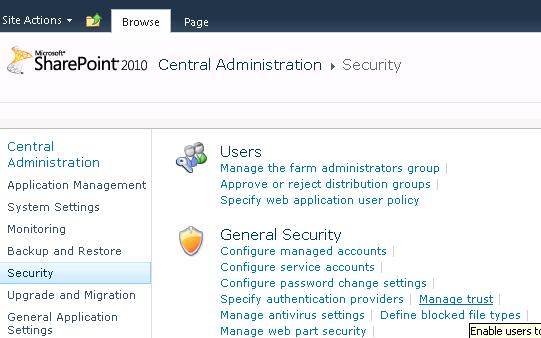 Open up Central Administration, and browse to “Security” then click on “Manage Trust”