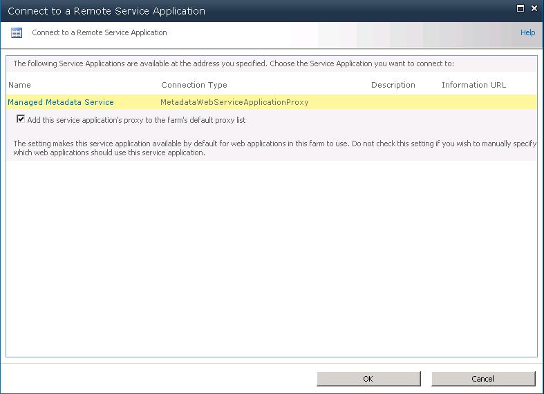 Click on “Connect” from the ribbon and select the appropriate Service Application Proxy Type.