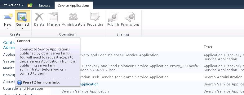 So with all of that in mind, how do we publish Service Applications between SharePoint 2010 farms in Central Administration”  Well not all of it can be done easily through Central Administration.