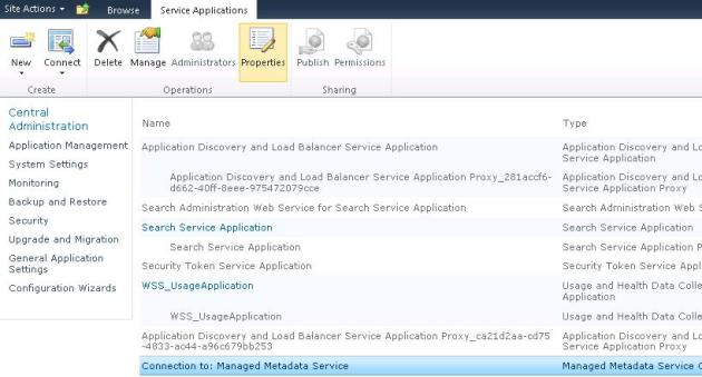 Now select your new service application and click “Properties” from the ribbon.